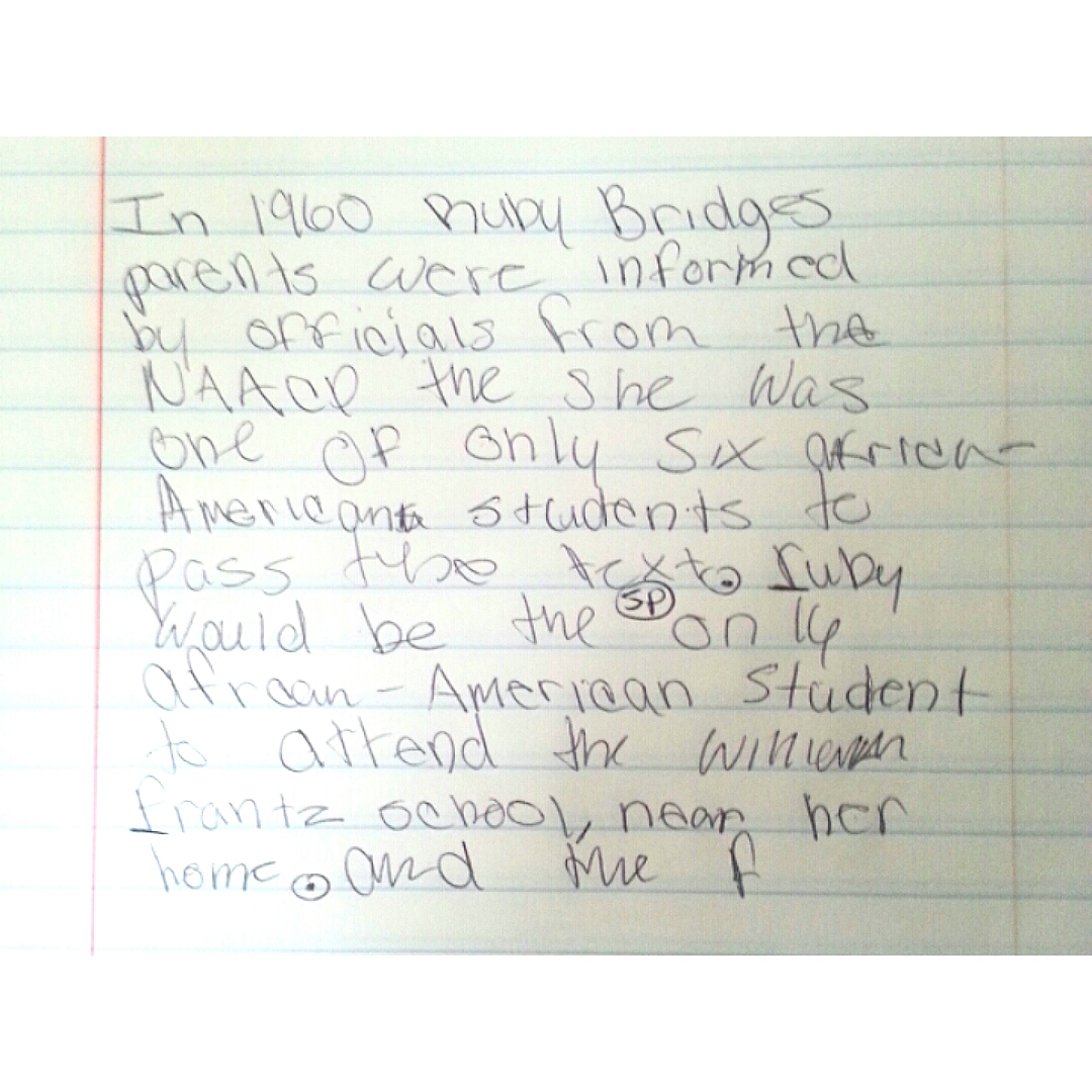 This past weekend my little sister asked me was it important to learn about Ruby Bridges. I told her “Of course! You want to learn as much about your history as possible. You never want to grow up feeling like everybody else know more about you than yourself.” Later on she asked me for some writing paper and I gave her a notebook. Yesterday I found the notebook and found her writing trap queen lyrics. Laugh, lol that’s my girl. What can I say? Today, I turned her page to start my own and I saw she wrote something else…….