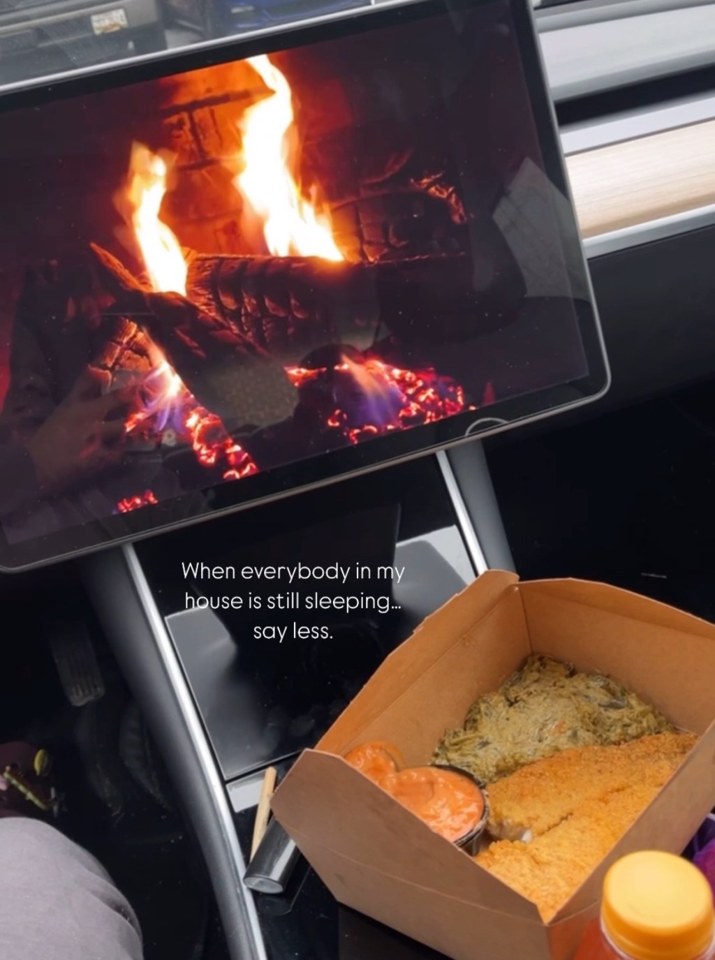 I’m posted in my car, eating last night’s catfish straight from the container. Cold, but still hitting. The warmth of the car wraps around me like a cocoon, but truth be told, I’d rather be in my dream setup—a tiny house tucked into my backyard. Just a cozy little space, all mine, where I could sit by a big window, listening to the rain, feet up, completely unbothered.